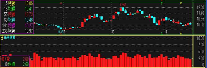 2.在下跌的行情中,平均每筆張數逐漸增大,顯示有大戶買進股票,股價近日可能止跌回升。