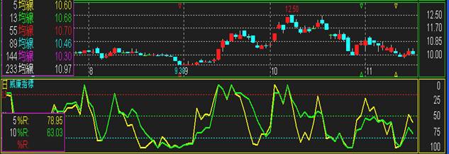 3.50稱為中軸線,當%R衝上50以上,股價開始轉強可以買入。同理由超買區跌破中