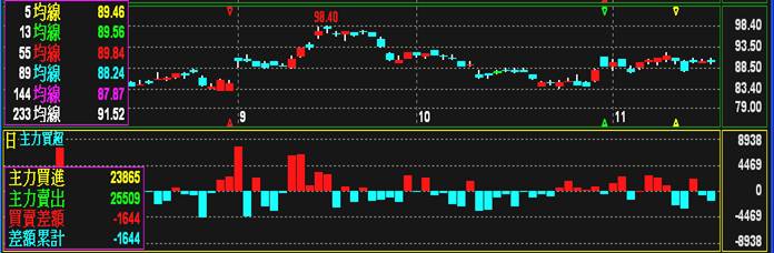 ;另可按[↑↓]鍵將作用視窗移動到「買賣差額」,移動查價線可查詢查價線