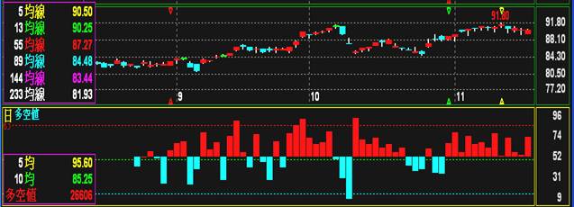 2.當多空指標線高於80時,次日收盤價低於開盤價之機率極高,短線