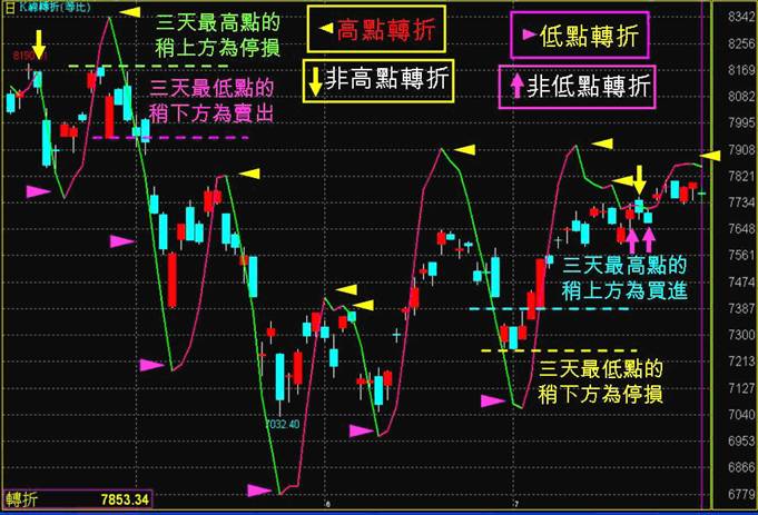 1.當指標的反轉點高於三天最高價稱為高點轉折,反轉點低於三天最高價稱為低點轉折。
