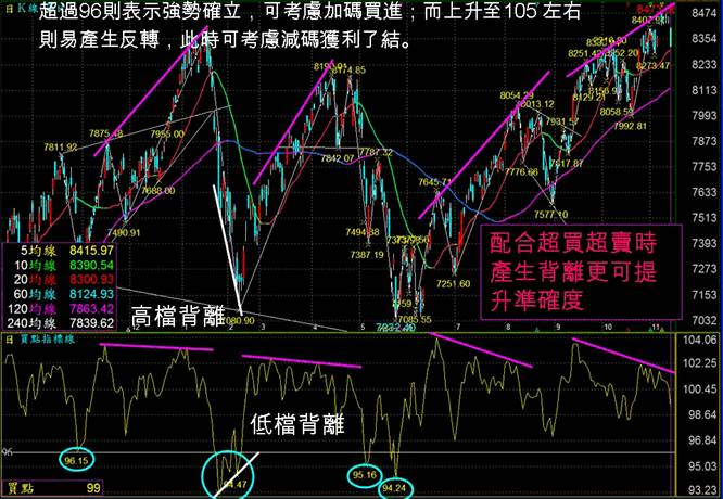 3.本指標配合超買超賣時產生背離更可提升準確度。