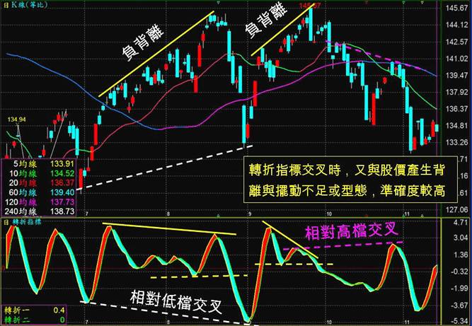 3.轉折指標交叉時,又與股價產生背離與擺動不足或型態,準確度較高。