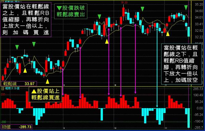 3.當股價站在輕鬆線之下,且輕鬆RB值縮腳,再轉折向下放大一倍以上,則加碼放空。