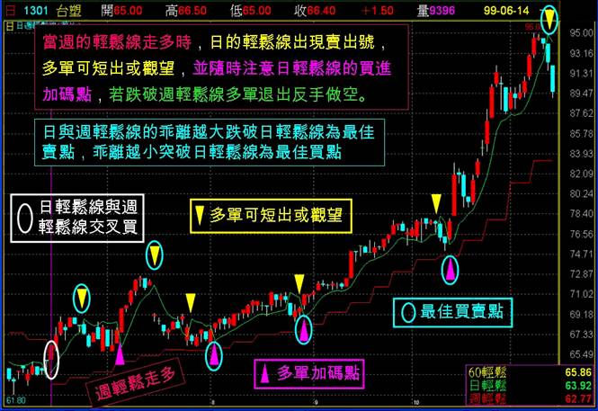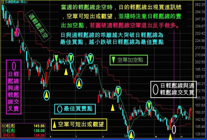 並隨時注意日輕鬆線的買進加碼點,若跌破週輕鬆線多單退出反手做空。