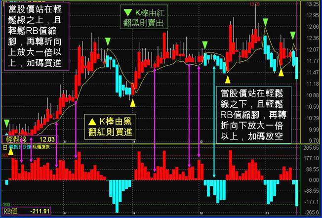 2.當股價站在輕鬆線之上,且輕鬆RB值縮腳,再轉折向上放大一倍以上,則加碼買進。