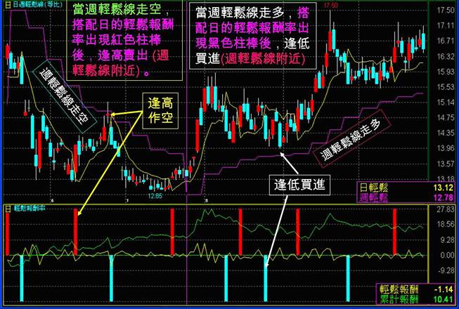 逢高作空,或是等週輕鬆K線翻紅,搭配日的輕鬆報酬率出現黑色柱棒時,逢低買進。