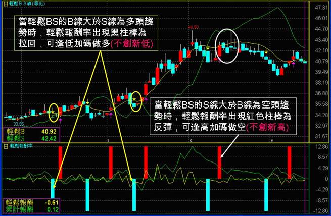 4.當輕鬆BS的B線大於S線為多頭趨勢時,輕鬆報酬率出現黑柱棒,可逢低加碼做多