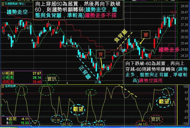 1.向上穿超60,然後再向下跌破60,則趨勢明顯轉弱。