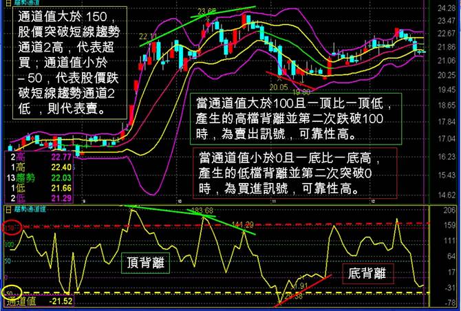 2. 通道值大於 150,代表股價突破短線趨勢通道2高,代表超買;通道值小於 -50