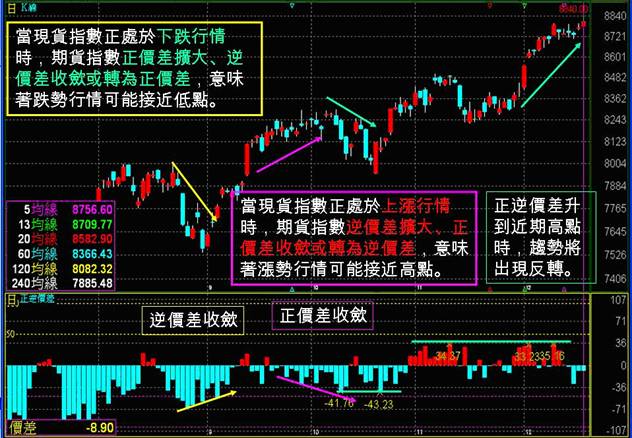 3. 正逆價差升到近期高點時,趨勢將出現反轉。