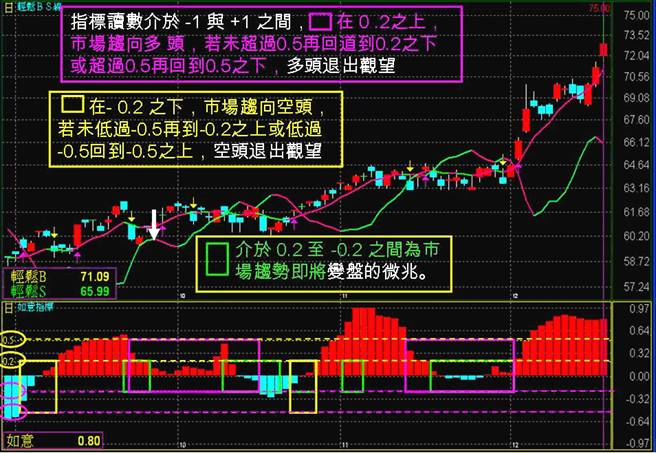 2.如意值突破前高,表示股價續漲;若跌破前低,表示股價續跌;