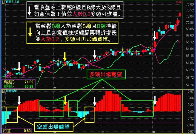 4.當收盤站上輕鬆B線且B線大於S線且如意值為正值並大於0.2多頭可進場。