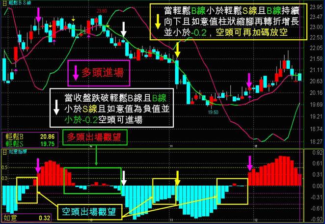 5.當收盤跌破輕鬆B線且B線小於S線且如意值為負值並小於-0.2空頭可進場。