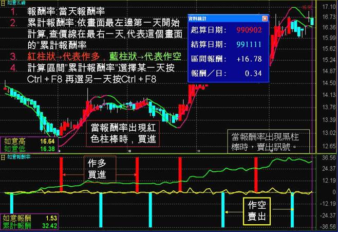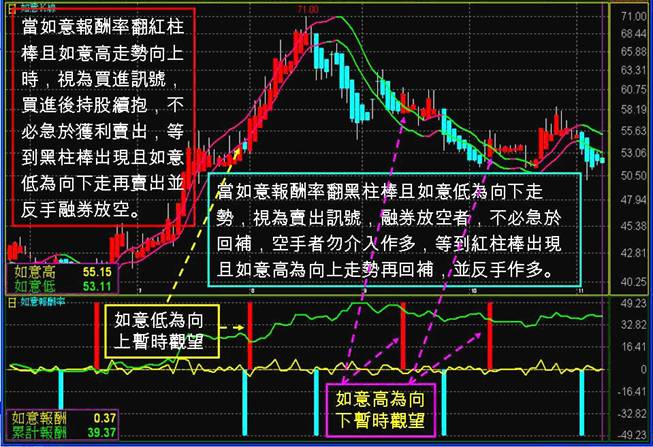 1.當報酬率翻紅柱棒且如意高走勢向上時,視為買進訊號,買進後持股