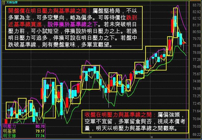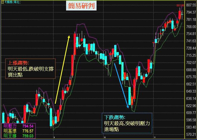 ② 明日壓力與基準線之間來回震盪,在盤中回檔至基準線止跌時,或攻破明日壓力拉回不破時,皆可買進。