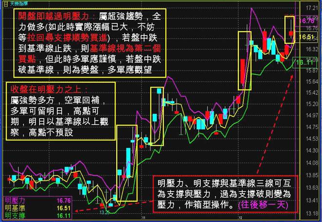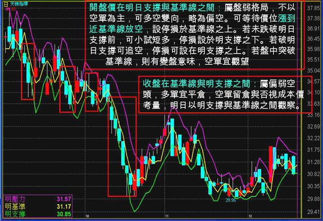 ③ 基準線與明日支撐之間來回震盪,在盤中回檔至明支撐止跌時可買進。