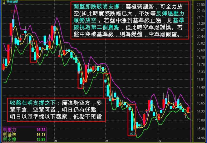 ② 基準線與明支撐之間來回震盪在盤中攻過基準線後回檔又跌破時或跌破明日支撐