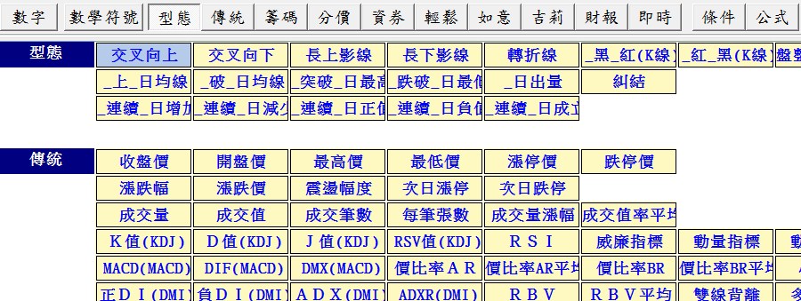4.籌碼(1代表:1張,可自行訂定) 1.主力買超:>0 2.主力賣超:<0 3.主力大買超: >500 4.主力大賣超: <-500 5.主力3日連續買超: 主力買超>1且1日前主力買超>1且2日前主力買超>1 6.主力3日連續賣超: 主力買超<-1且1日前主力買超<-1且2日前主力買超<-1 7.外資買超:>1 8.外資賣超:<1 9.外資大買超:>500 11.外資大賣超:<-500 11.外資3日連續買超: 外資買超>1且1日前外資買超>1且2日前外資買超>1 12.外資3日連續賣超: 外資買超<-1且1日前外資買超<-1且2日前外資買超<-1 註:有買賣超不能用”型態”中的”連續__增加(減少)”; 只能應用在;成交量、資券等增減量方可應用。